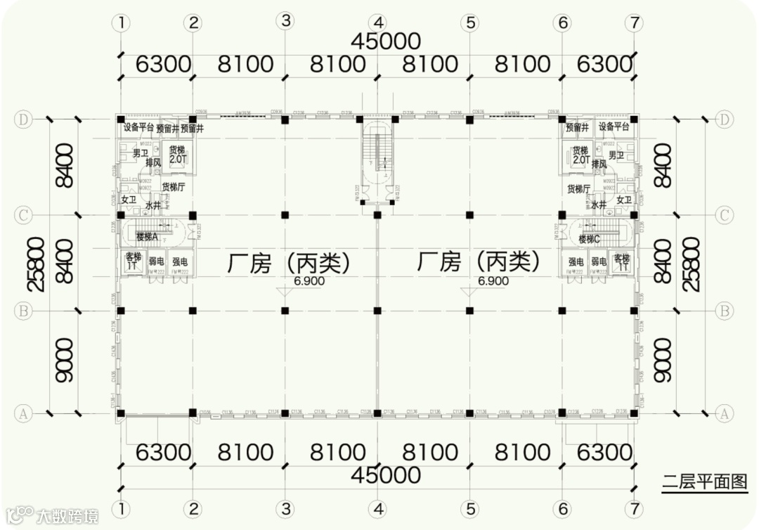 五层双拼产品单栋面积约2870㎡,单层面积约600㎡,层高:6.9/4.5/4.5/3.9/3.9m