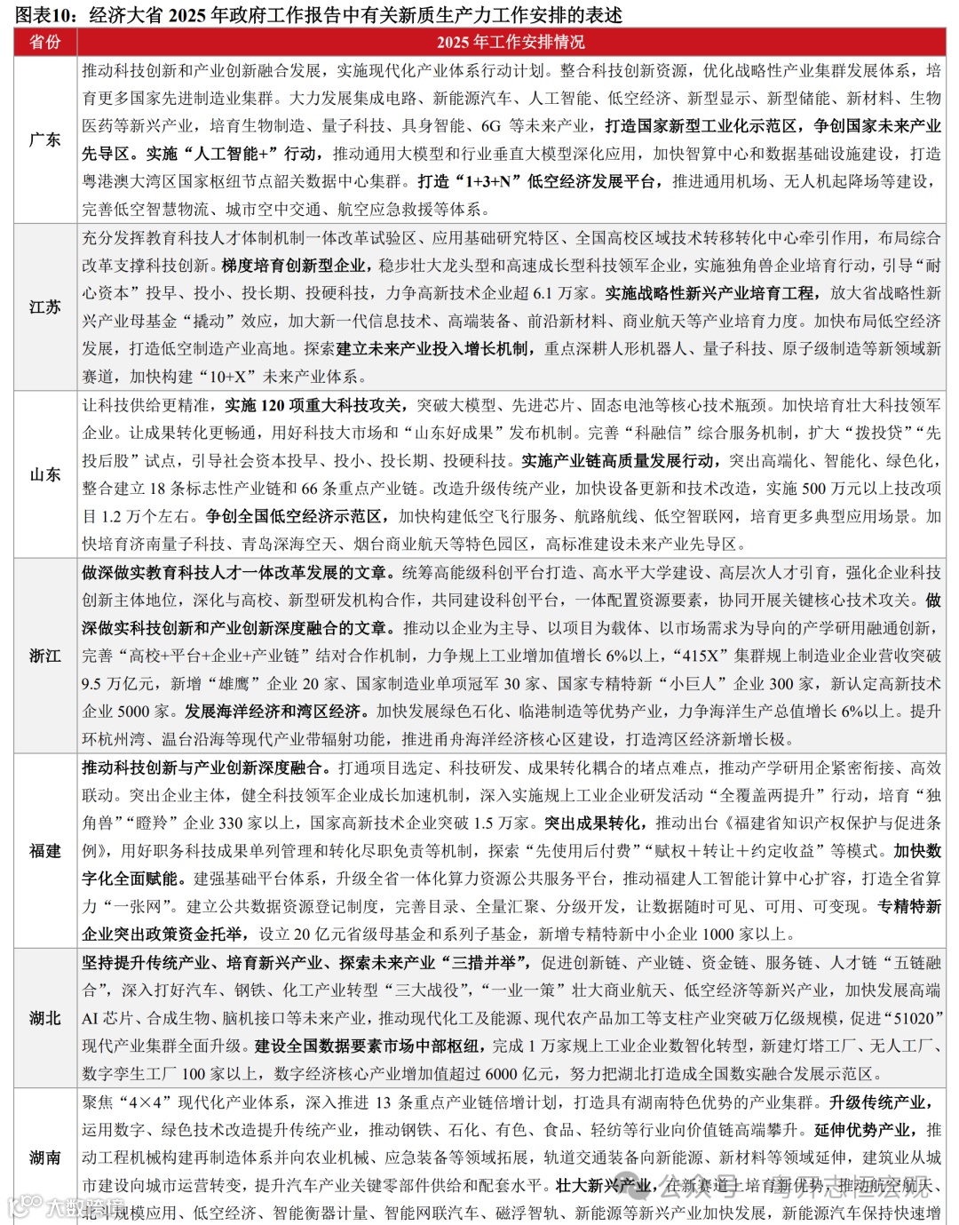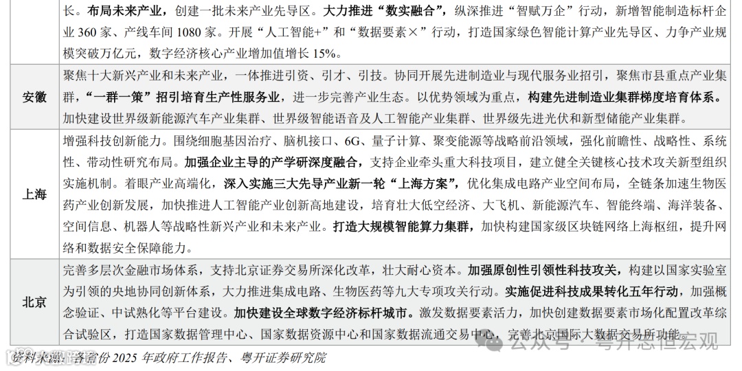 二是加快新兴产业集群发展,加速完善未来产业政策体系。广东、江苏、北京均提出要综合治理一些行业“内卷式”竞争,促进产业统筹布局、良性发展。各地加快新兴产业集聚,推动优势产业集群发展,促进优势产业和优势地区的增长。2025年,安徽要建设具有国际竞争力的先进制造业集群,加快建设世界级新能源汽车产业集群、世界级智能语音及人工智能产业集群、世界级先进光伏和新型储能产业集群。各地未来产业进入“政策导入期”,下一步将在产业链前端和后端着力。前端,要推动颠覆性创新,补齐科技成果转化薄弱环节。后端,要开拓技术和产品应用场景,以扩大需求带动产业发展。目前各地区已经开展了诸多先行探索,北京、广东、江苏、浙江等多个省市建立未来产业发展先导区。上海着眼产业高端化,加快推进人工智能产业创新高地建设,培育壮大低空经济、大飞机、新能源汽车等战略性新兴产业和未来产业。