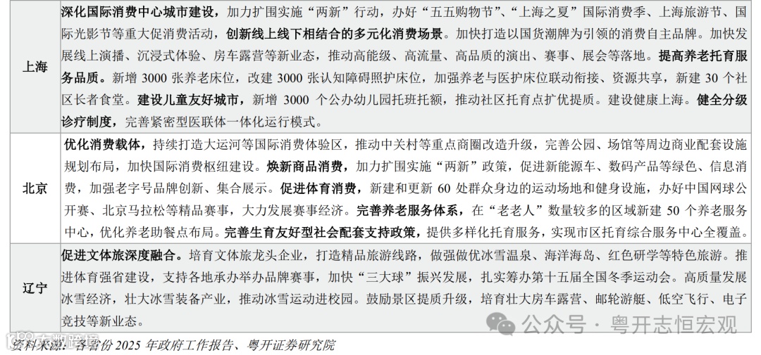 第二,支持服务消费,拓宽消费场景发展新型消费。一是支持餐饮服务消费。四川2025年将开展“味美四川”川派餐饮汇活动,分批次发放特色消费券,着力扭转餐饮等服务领域消费回落趋势。二是促进文旅体育消费。北京促进体育消费,新建和更新运动场地和健身设施,大力发展赛事经济。三是拓宽消费场景,促进线上和线下消费。广东吸引培育消费平台企业,推进智慧商圈、智慧街区、智慧门店建设;山东加快发展平台经济,建设一批“好品山东”电商中心;浙江拓展消费新场景新业态,培育壮大首发经济、银发经济、会展经济、演艺经济。上海更加注重推进服务消费扩容升级,加快打造以国货潮牌为引领的消费自主品牌,加快发展线上演播、沉浸式体验、房车露营等新业态。