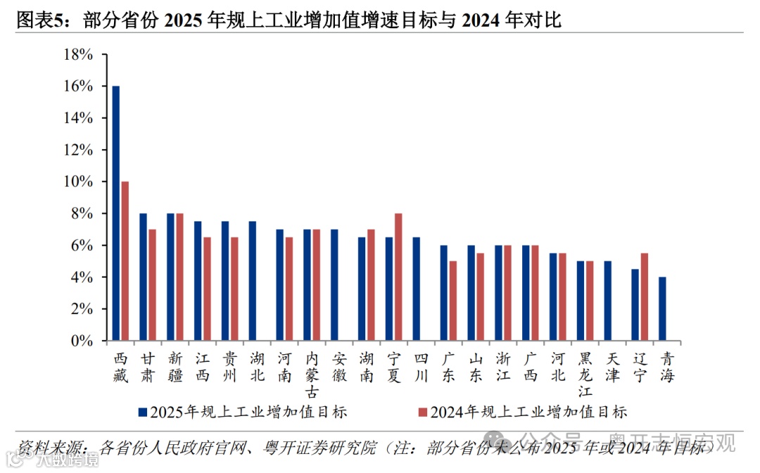 1、工业生产目标较高,消费目标下调。从生产看,多数省份上调工业增加值预期目标,争取工业经济开门红。2025年,广东由5%上调至6%左右,山东由5.5%上调至6%以上,浙江由6%左右调整为6%以上。中西部省份预期增速较高,西藏设定为16%、高于上年的10%,甘肃、新疆均设定为8.0%,江西、湖北均设定为7.5%。从消费看,多数省份社零增速目标下调幅度较大,居民消费需求仍有待提振。2025年,湖北由9%调整为7%左右,河南由7%调整为6%,福建由6%调整为5.5%,广东由6%调整为5.5%,浙江由5.5%左右调整为5%以上。