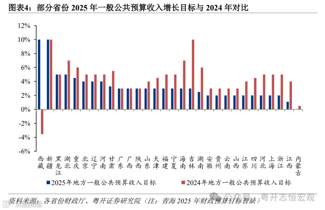 受有效需求不足、工业品价格负增长、部分行业企业盈利困难、居民消费偏弱等因素拖累,多数省份下调2025年财政收入目标。与2024年一般公共预算收入增速相比,仅有西藏上调目标,5个省份目标持平,24个省份下调2025年一般公共预算收入增速目标。广东连续两年将一般公共预算收入增长目标设置为3%,广西、陕西也维持3%增长目标不变。吉林财政收入目标下调最大的是吉林,从10%调整为3%,或与汽车市场竞争加剧影响工业企业利润、房地产市场持续低迷等有关。海南财政收入目标从7%调整为3%,下调幅度较大与海南经济结构调整有关,2024年海南财政收入同比-1.1%,房地产相关税收大幅下降。除广东外主要经济大省2025年财政收入增长目标也均有不同程度下调。浙江、上海从上年的5%调整为2%,江苏从上年的4%调整为2%,山东从4.0%调整为3.0%,河南从5%调整为4%。