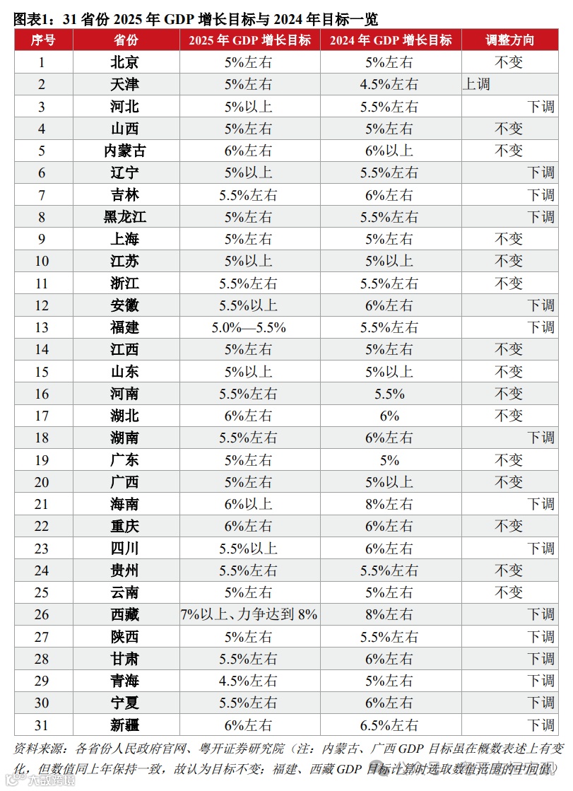 3、分省份看,仅天津上调了2025年GDP增长目标,15个省份下调经济增长目标,15个省份目标基本持平。部分省份结合内外部环境变化下调GDP目标,但在宏观政策有利条件支撑下GDP目标调整幅度不大。增速目标下调幅度最大的是海南,从8.0%调整为6.0%。除海南以外,其他下调GDP目标的省份调整幅度都在0.5个百分点以内。