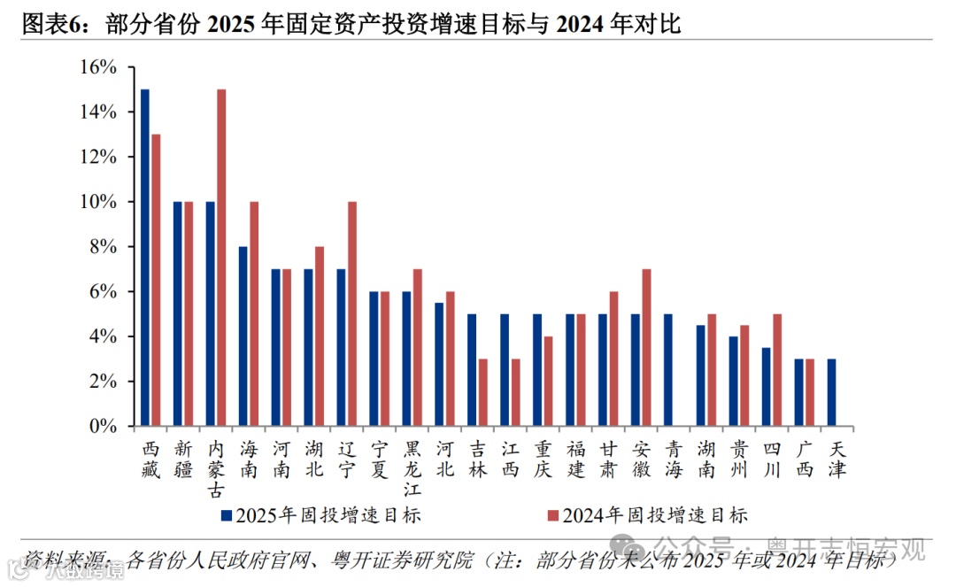 从变化看,与2024年相比,仅天津上调2025年GDP增长目标,15个省份下调GDP增长目标,15个省份基本持平。31省份中,仅天津上调GDP目标,从2024年“4.5%”提升至2025年的“5%左右”,主要是由于京津冀协同发展带动天津基建投资高增长,提振了经济增长预期。海南2025年GDP目标下调幅度最大,从“8%左右”调整为“6%以上”,这与2024年海南实际经济增长仅3.5%,主动调整经济增长预期有关。分区域看,东部省份倾向于不变。中部省份中,河南、湖北、江西、山西四省GDP目标仍保持不变;西南省份中,仅四川下调,重庆、贵州、云南GDP目标保持不变;西北五省GDP目标普遍下调,均较上年下降0.5个百分点。