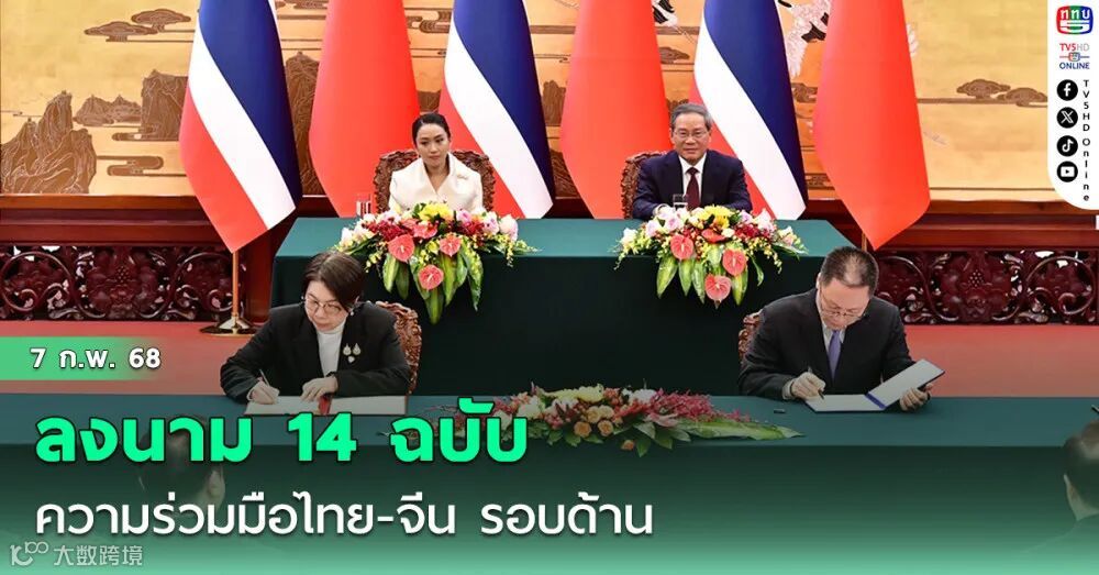 随后,双方共同见证中泰有关部门签署14份谅解备忘录,涉及人工智能、水产品出口、跨境贸易、邮政服务、数字经济投资等领域合作。