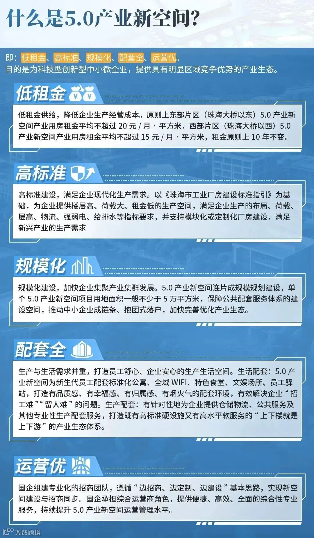 5.0产业新空间是指适应新形势、赋能新技术、承载新产业,契合创新驱动发展要求的新型载体,具备“低租金、高标准、规模化、配套全、运营优”五大特点。