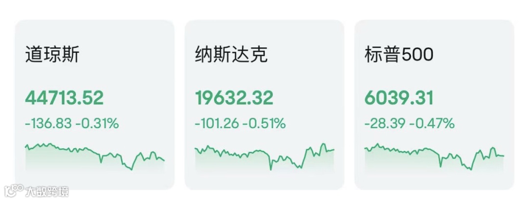 美东时间周三,美股三大指数集体收跌。截至收盘,道指下跌136.83点,跌幅0.31%,报44713.52点;纳指下跌101.26点,跌幅0.51%,报19632.32点;标普500指数下跌28.39点,跌幅0.47%,报6039.31点。