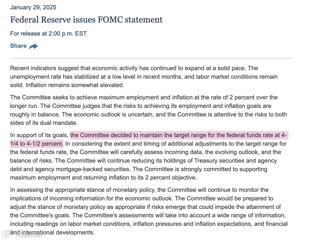1月30日凌晨,美联储宣布将联邦基金利率目标区间维持在4.25%至4.50%之间。这是美联储自2024年9月连续降息以来首次维持利率不变,符合市场预期。