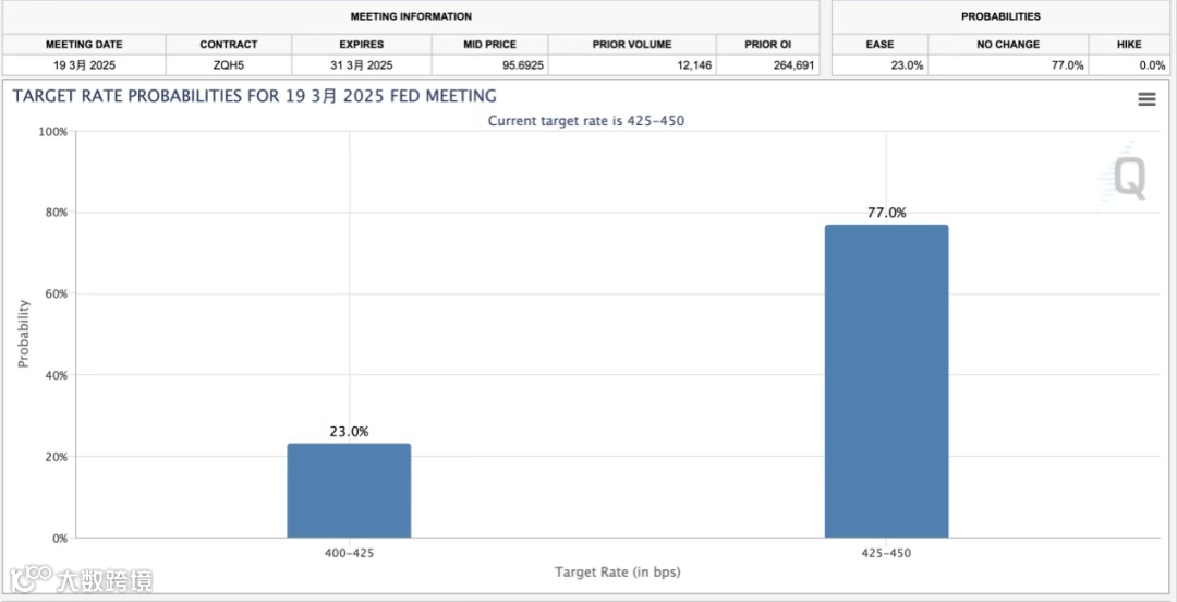 “美联储观察”,美联储3月维持利率不变的概率为77%,降息25个基点的概率为23%。