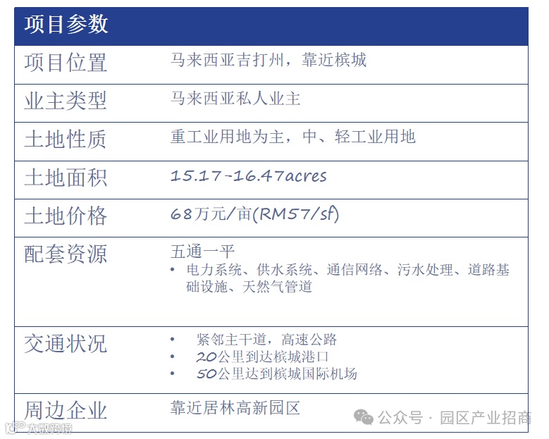 位于马来西亚吉打州的居林园区,总面积达92-100亩(约6.14-6.67公顷),土地价格为68万元/亩(RM57/sf)。项目由马来西亚私人业主开发,土地性质以重工业用地为主,兼具中、轻工业用地,交通便利,配套设施完善,是区域内稀缺的优质工业用地,适合各类制造企业入驻。