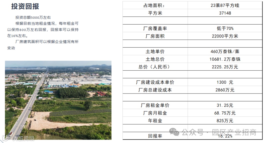 投资总额预计为5000万左右人民币,其中土地总价为10681.2万泰铢,折合人民币约2225.25万元;厂房建设成本单价为1300元,总建设成本为2860万元。