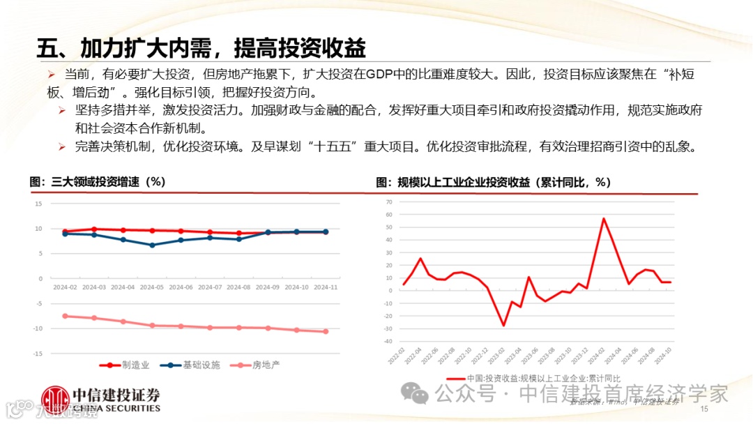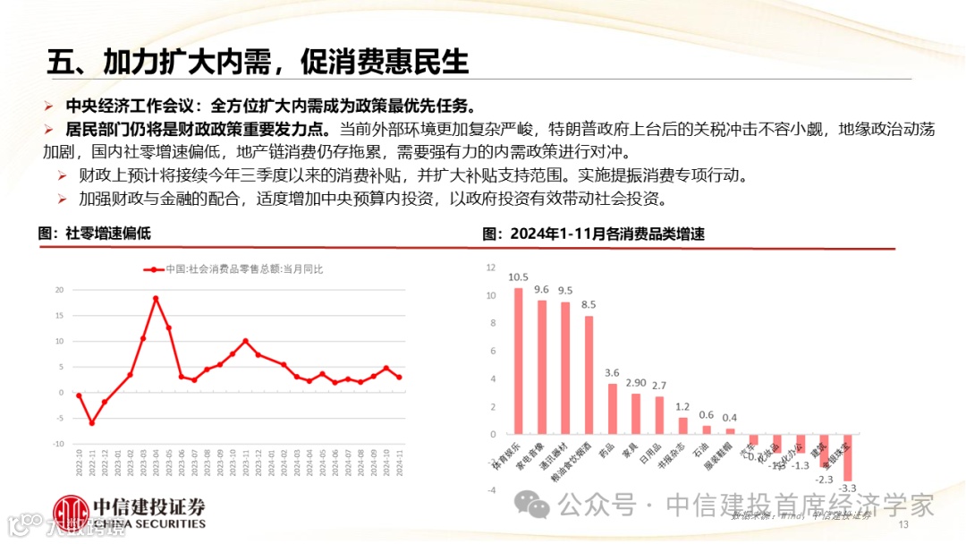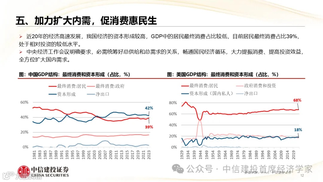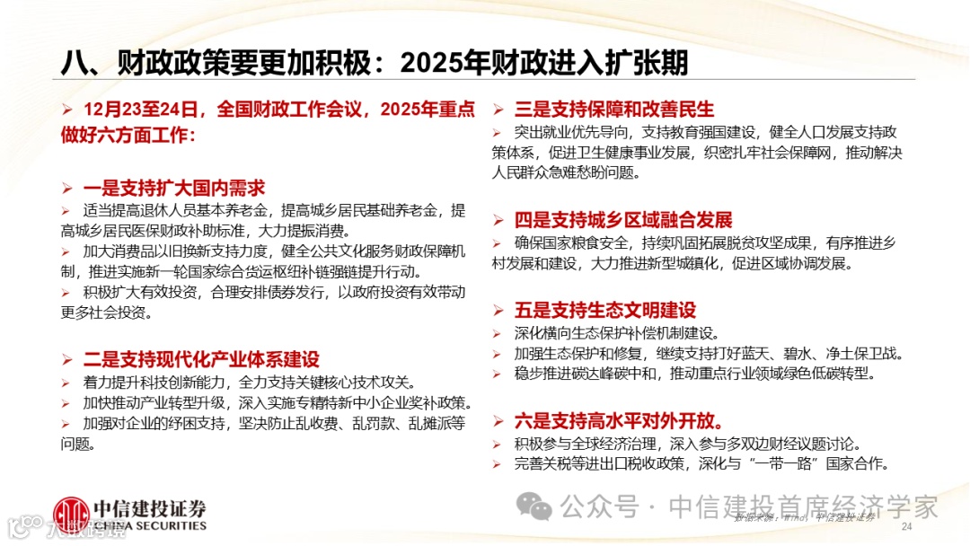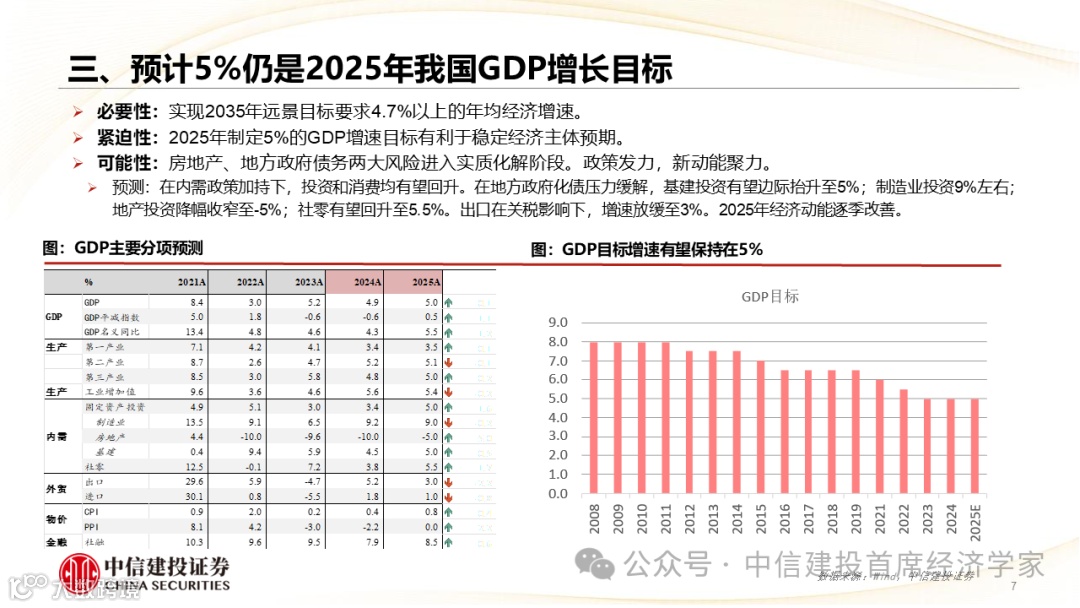 预计5%仍是2025年我国GDP增长目标,提升通货膨胀预期应成为关键任务,居民部门将是政策重要发力点,内需提振需加力增效。