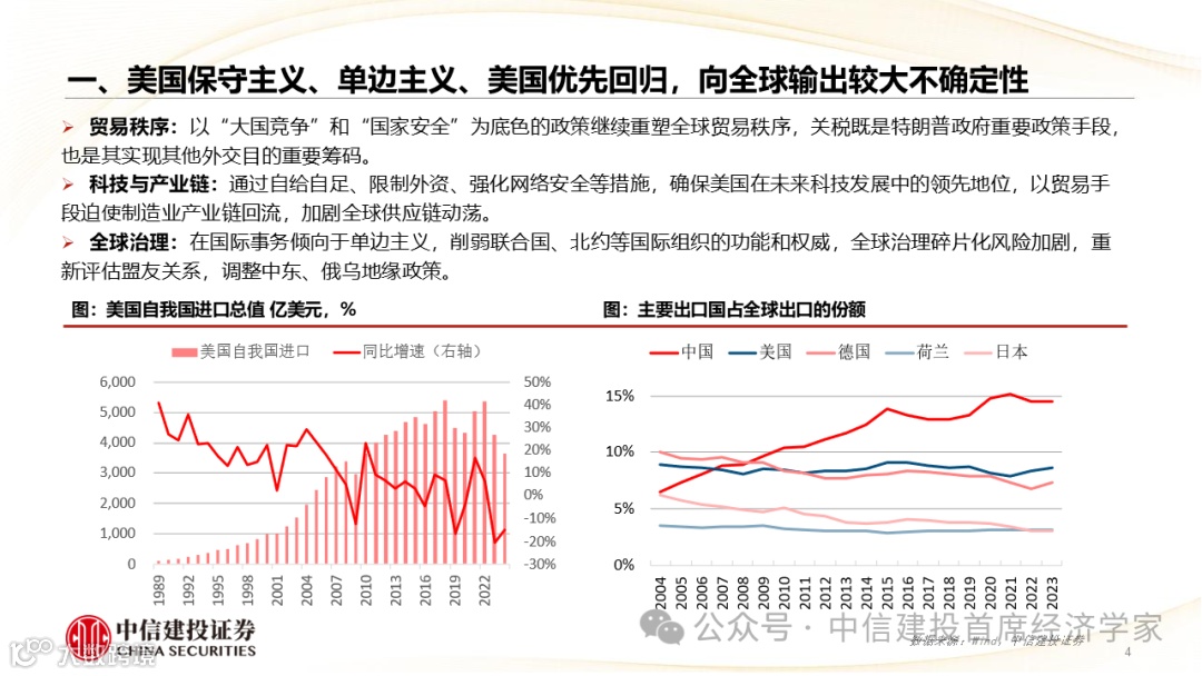 美国保守主义、单边主义、美国优先回归,给全球输出较大不确定性,特朗普政策存在内部冲突性,给全球金融市场带来新扰动,非美国家汇率和资金流动存在风险。