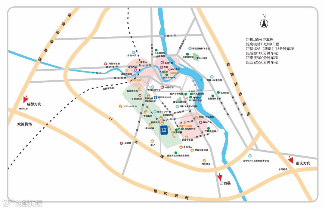 机场:距绵阳南郊机场仅5分钟车程,绵阳机场开通有直达北京、上海、广州、深圳等近42个城市的59条航线。距成都双流国际机场仅1.5小时车程,同时绵阳高铁也可直达双流机场。