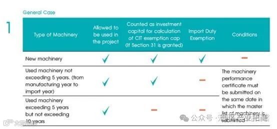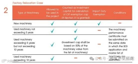 注:BOI指南2023年版规定,进口的旧设备或二手设备,根据出厂日期与进口日期之间间隔的时长,享受不同的待遇。