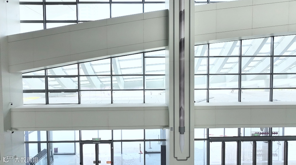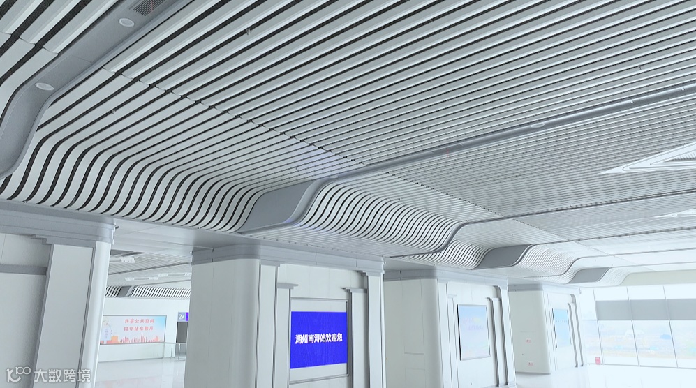 湖州南浔站候车室内的菱形结构吊顶,与外立面相呼应。候车室一侧嵌壁式灯柱像一支支矗立的巨型“湖笔”,将湖笔的非遗元素融入站房设计。