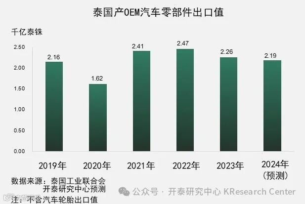 受到出口市场的汽车产量下降的拖累,预计2024年泰国产OEM汽车零部件出口值将降至2,190亿泰铢,同比萎缩2.9%。