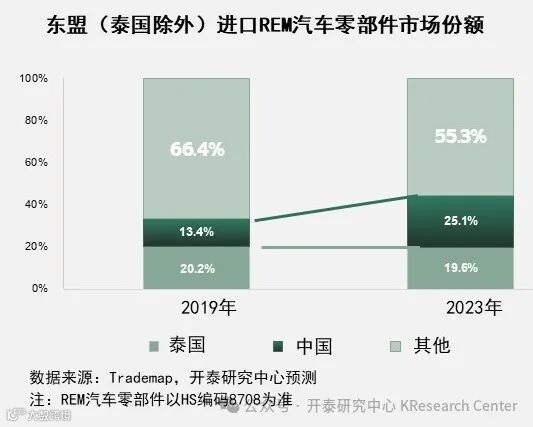 近几年中国产汽车逐渐抢占泰国的出口市场份额,尤其是在东盟这一主要市场,使泰国在东盟(泰国除外)进口汽车市场的份额仅剩24.6%,导致东盟市场对泰国REM汽车零部件的需求下降,进而造成泰国产REM汽车零部件在东盟(泰国除外)的市场份额降至19.6%。