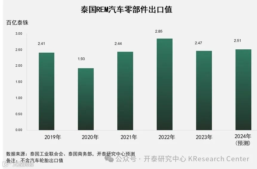 由于中国产REM汽车零部件正在逐步渗透泰国现有出口市场并成为泰国产REM汽车零部件的有力竞争对手,开泰研究中心预计2024年泰国REM汽车零部件的出口值将达到251亿泰铢,小幅增长2.0%。
