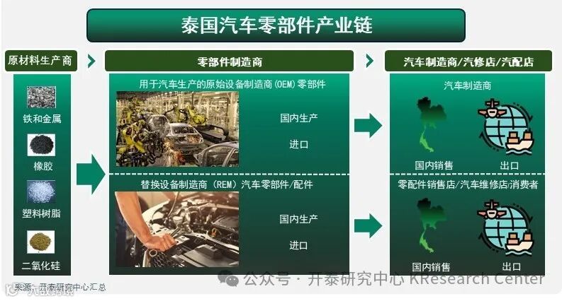 泰国是全球汽车及零部件的主要生产基地之一。2023年泰国汽车产量超过180万辆,位居世界第十。这得益于泰国完整的汽车产业链体系,涵盖重要原材料如橡胶、塑料的生产和两大类汽车零部件的制造:用于汽车组装生产的原始设备制造商(OEM)零部件(占泰国产汽车零部件销售额四分之三)和用于汽车维修保养的替换设备制造商(REM)零部件(占泰国产汽车零部件销售额四分之一)。泰国也进口部分汽车零部件,但比例相对较低。