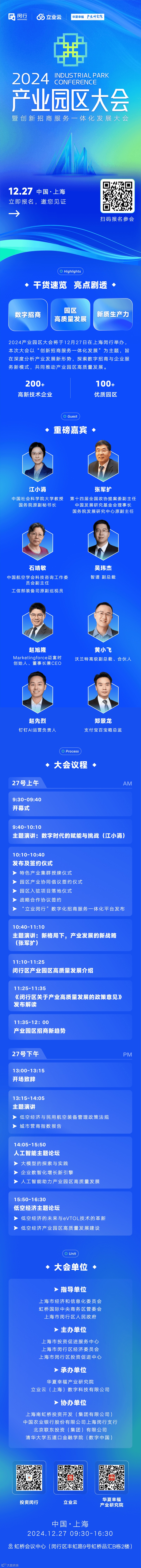 2024产业园区大会将于12月27日在闵行“大虹桥”举办,本次大会以“创新招商服务一体化发展”为主题,旨在深度分析产业发展新形势,探索数字招商与企业服务新模式,共同推动产业园区高质量发展。