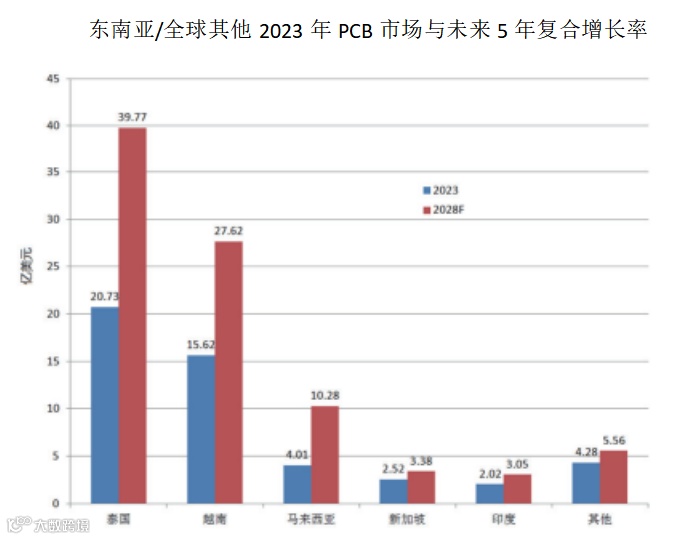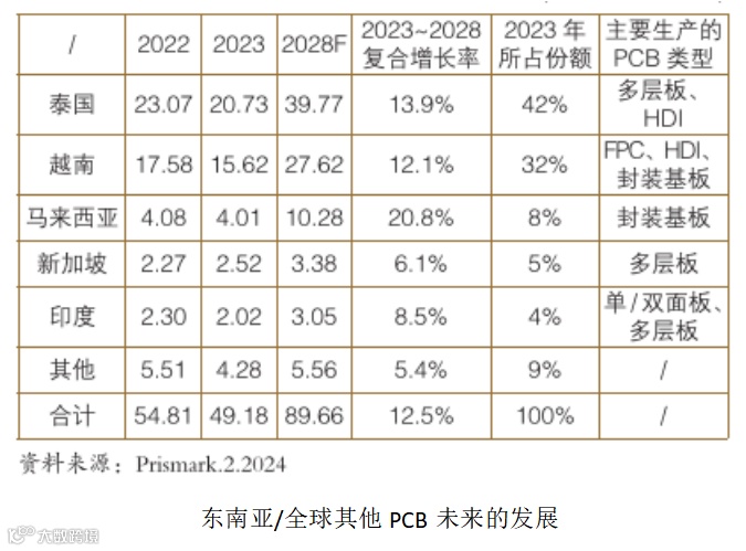 泰国是PCB行业在东南亚区域的产业基地之一,2023年很多PCB企业宣布在东南亚设厂。值得注意的是,此前多是日资、台资PCB企业赴东南亚设厂,这两年国内PCB企业也陆续有所规划,如奥士康、中京电子、中富电路、四会富仕等;已在当地设厂的企业也有扩充产能的规划,如泰鼎、精成科等。在大环境诸多挑战的环绕下,产能外移已成为趋势,南向的厂商愈来愈多,以应长期东南亚生产制造需求将会持续成长。东南亚/全球其他2023年PCB市场与未来5年复合增长率见下表,东南亚/全球其他PCB未来的发展见下图。