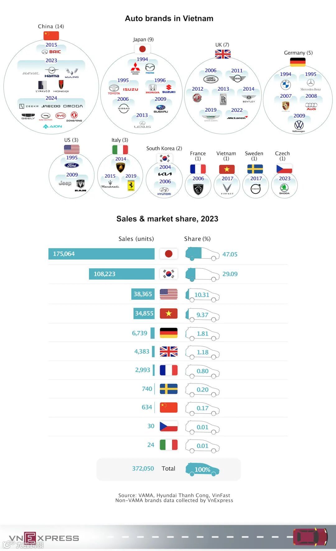 然而,在市场份额方面,各国品牌之间存在着明显的差距。日本品牌以 175,064 辆的销量遥遥领先,占据了高达 47.05% 的市场份额,这充分显示了日本汽车在越南消费者心中的深厚根基和高度认可。韩国品牌以 108,223 辆的销量和 29.09% 的市场份额紧随其后,展现出较强的市场竞争力。美国品牌售出 38,365 辆,市场份额为 10.31%。越南本土品牌 VinFast 表现颇为强劲,销售了 34,855 辆,占据 9.37% 的市场份额,成为越南汽车市场的重要力量。相比之下,德国品牌销量为 6,739 辆,市场份额 1.81%;英国品牌销量 4,383 辆,市场份额 1.18%;法国品牌销量 2,993 辆,市场份额 0.80%;瑞典品牌销量 740 辆,市场份额 0.20%;而中国品牌在 2023 年的销量为 634 辆,市场份额仅为 0.17%,意大利品牌销量更是仅有 24 辆,市场份额仅 0.01%。虽然中国品牌目前在市场份额上占比较小,但品牌数量的超越为未来发展奠定了基础。
