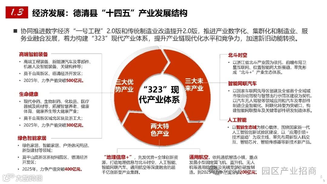 德清县积极推进数字经济 “一号工程” 2.0 版和传统制造业改造提升 2.0 版,致力于构建 “323” 现代产业体系。在高端智能装备领域,依托浙江省北斗产业园,布局卫星互联网、位置智能新赛道,形成 “北斗 +” 产业生态,2025 年力争产值突破 500 亿元;智能网联汽车产业借助国家车联网先导区创建及全省首个全域自动驾驶与智慧出行示范区建设契机,构建整车及关键零部件研发制造体系,2025 年力争产值突破 300 亿元;生命健康产业涵盖现代中药、生物制药、医疗器械等多个领域,2025 年力争产值突破 200 亿元;以智能生态城为核心的人工智能产业和以通航智造小镇为依托的通用航空产业也在蓬勃发展,目标是打造深度融合的超千亿创新型产业集群,推动产业数字化、集群化和制造业与服务业融合发展,加速新旧动能转换。