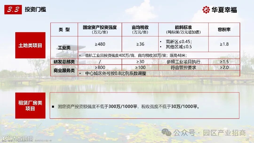 租赁厂房类项目:固定资产投资额强度不低于 300 万 / 1000 平,税收强度不低于 30 万 / 1000 平。
