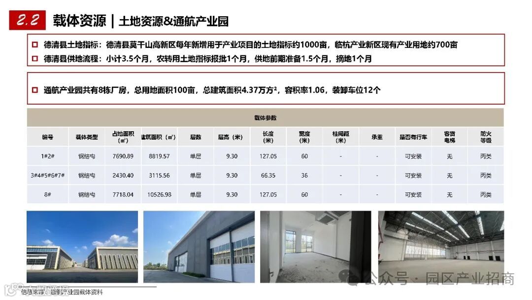 通航产业园:共有 8 栋厂房,总用地面积 100 亩,总建筑面积 4.37 万方,容积率 1.06,装卸车位 12 个,为通航相关企业提供了优质的生产空间。