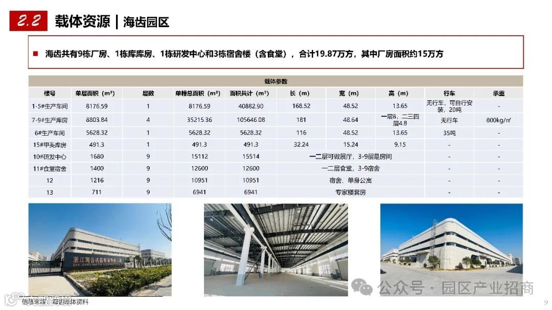 海齿园区:包含 9 栋厂房、1 栋库房、1 栋研发中心和 3 栋宿舍楼(含食堂),合计 19.87 万方,其中厂房面积约 15 万方,各类建筑设施齐全,可满足不同企业的需求。