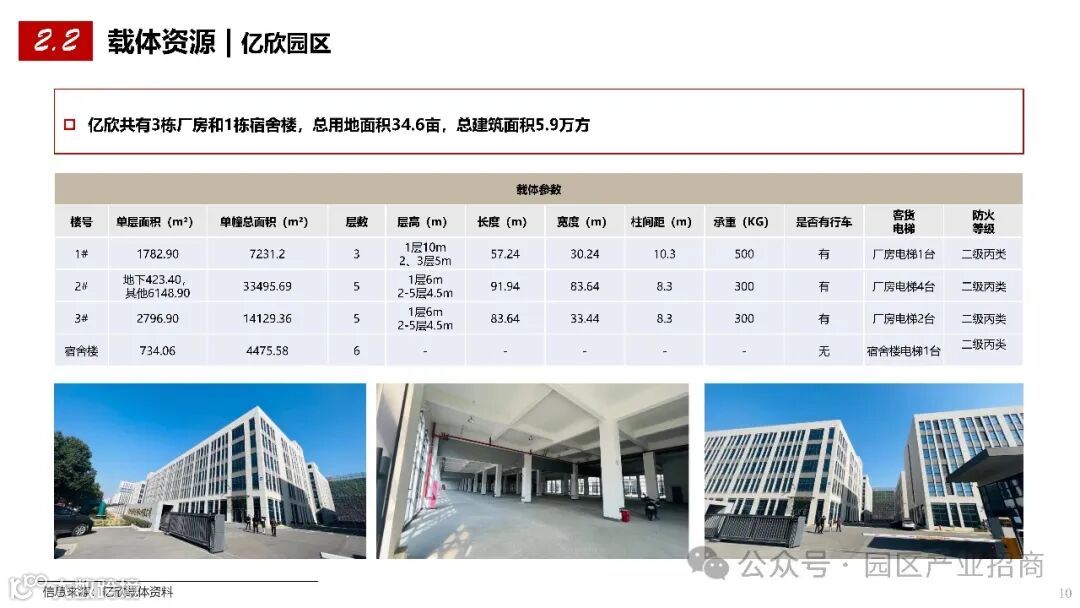亿欣园区:由 3 栋厂房和 1 栋宿舍楼组成,总用地面积 34.6 亩,总建筑面积 5.9 万方,配备了相应的生产和生活设施,为企业的入驻和发展提供了便利条件。