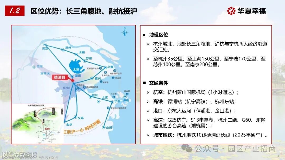 德清地处长三角腹地,位于杭州城北,是沪杭与宁杭两大经济廊道的交汇处,区位优势得天独厚。其交通网络四通八达,航空方面,距杭州萧山国际机场仅 1 小时车程;高铁有德清站(杭宁高铁)和杭州东站;港口可依托京杭大运河(乍浦港、金山港);高速公路纵横交错,G25 杭宁、S13 申嘉湖、杭州二绕、G60 环绕,即将建设的苏台高速(湖杭段)也将进一步提升交通便利性;此外,杭州地铁 10 线德清延长线将于 2025 年通车,届时将无缝对接杭州主城区。德清至杭州仅 35 公里,至上海 150 公里,至宁波 170 公里,至苏州 100 公里,至南京 200 公里,为企业的物流运输和商务往来提供了极大的便利。