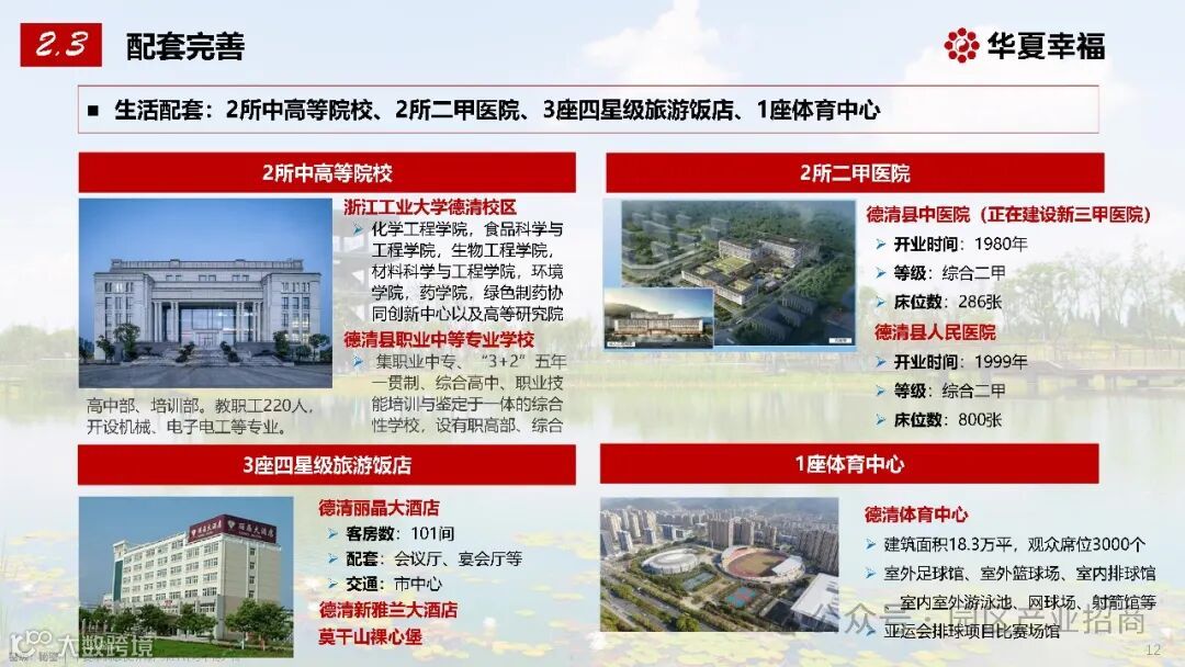 医疗设施:德清县中医院(正在建设新三甲医院)和德清县人民医院等 2 所二甲医院,为居民和企业员工提供优质的医疗服务。
