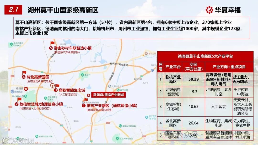 临杭产业新区:面积达 58.29 平方公里,重点发展高端装备、通用航空、新材料、电力电气等产业,汇聚了浙江鼎力、天马轴承等知名企业,是德清面向杭州的南大门,工业企业超 1000 家,规模企业 123 家,拥有主板上市企业 1 家,产业基础雄厚。