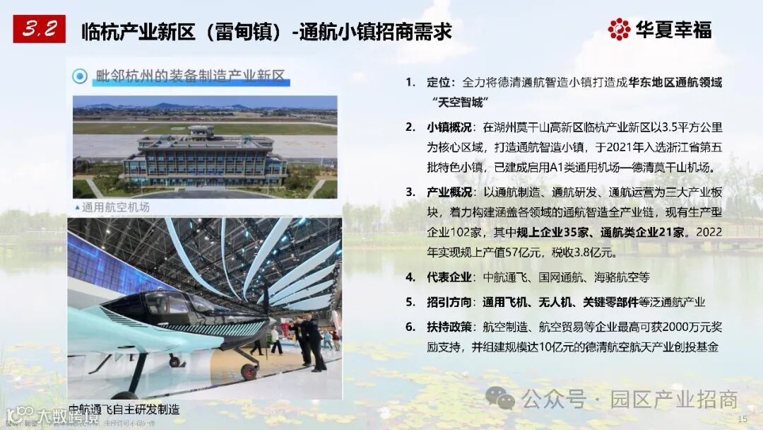 产业现状与目标:现有生产型企业 102 家,规上企业 35 家、通航类企业 21 家,2022 年规上产值 57 亿元,税收 3.8 亿元。未来将继续以通航制造、通航研发、通航运营为三大产业板块,构建全产业链,重点招引通用飞机、无人机、关键零部件等泛通航产业。