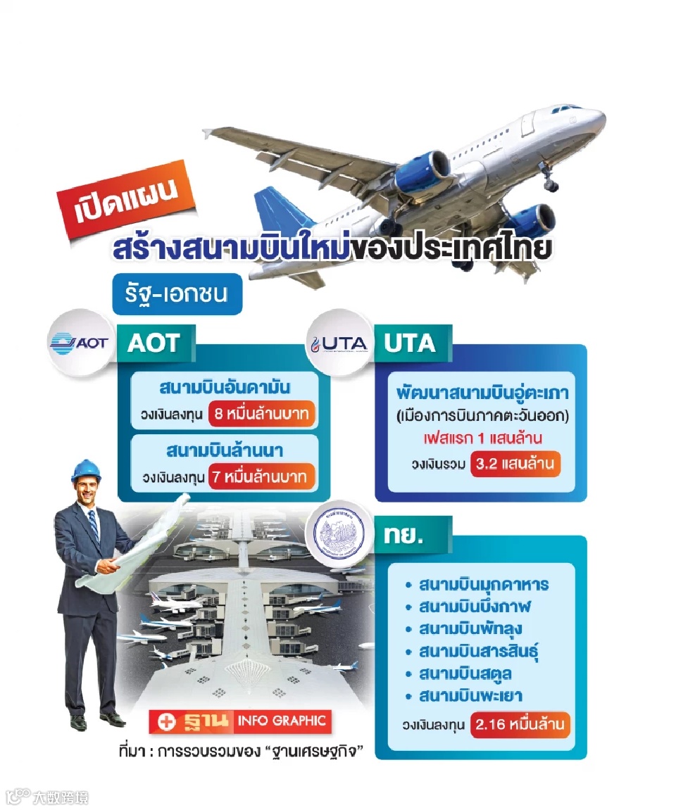 泰国机场管理局计划在穆达汉府、汶干府、博他仑府、加拉信府、沙敦府和帕夭府各修建1座新机场,共计6座机场,初步预算216亿泰铢。这些投资将有助于应对未来20年全球客运量翻番的预期,尤其是亚太地区。