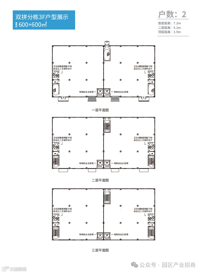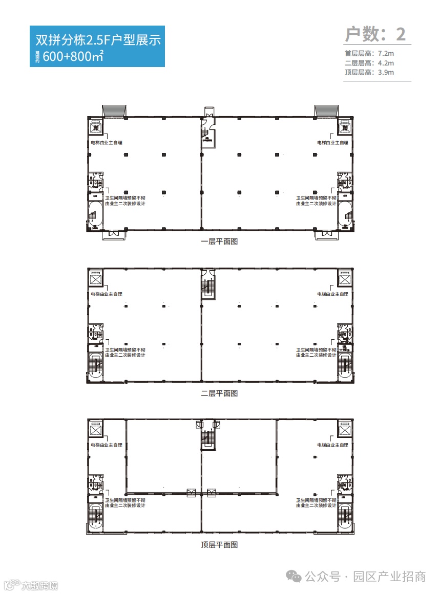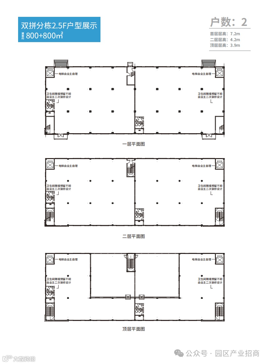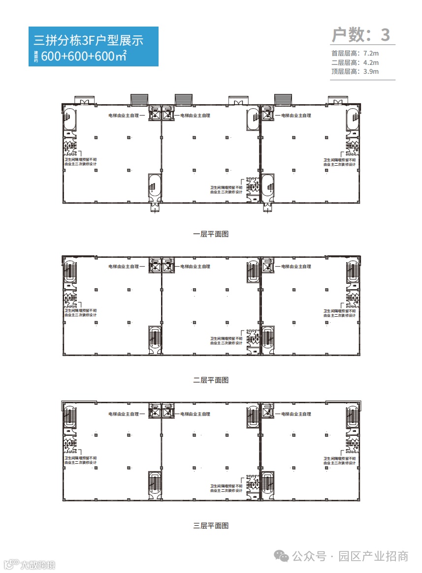 层高:首层:7.2M;二层:4.2M;顶层:3.9M