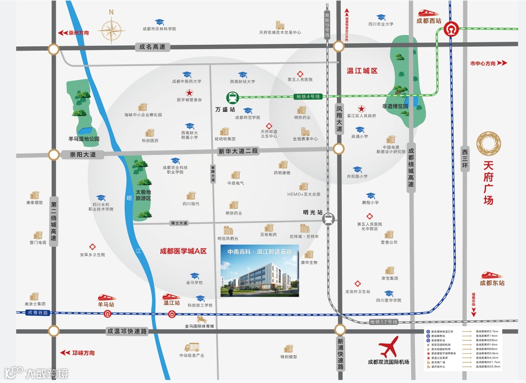 机场:项目距天府国际机场69公里,1个小时车程;距离双流国际机场14公里,30分钟车程。