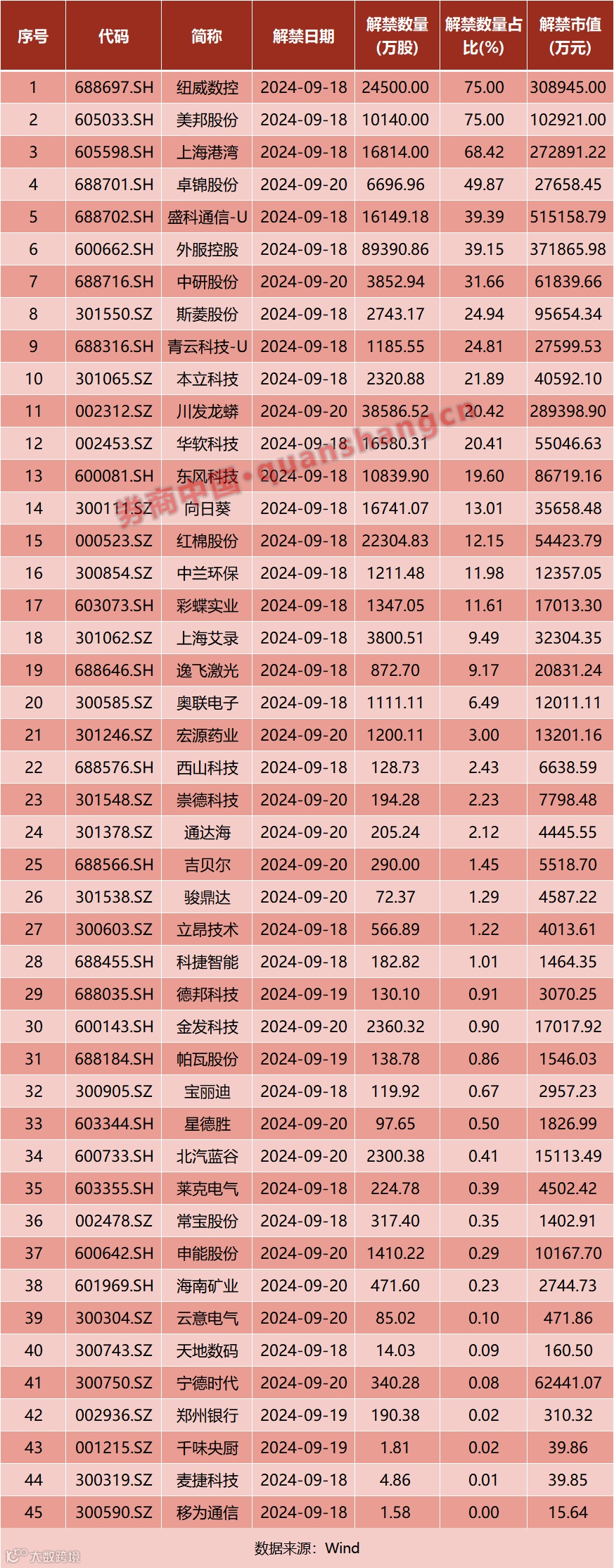 数据显示,本周(9月16日—9月20日)共有45家公司限售股陆续解禁,合计解禁量29.82亿股,按9月13日收盘价计算,解禁市值为261.24亿元。