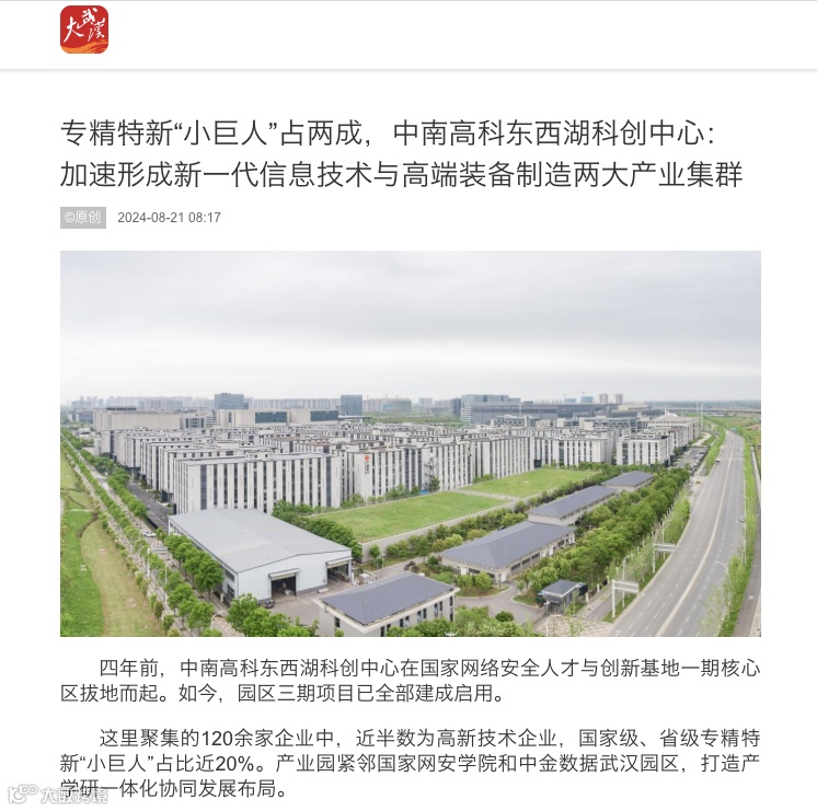 8月21日,《长江日报》以《专精特新“小巨人”占两成,中南高科东西湖科创中心:加速形成新一代信息技术与高端装备制造两大产业集群》为题推出专题报道,深入挖掘中南高科东西湖科创中心如何以产业生态圈思维助力园区企业高质量发展的产业故事,点赞中南高科厚植产业沃土的卓越实力。