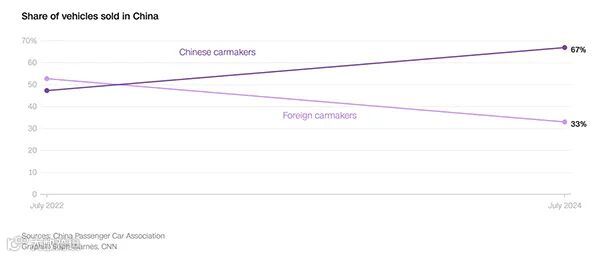 中国乘用车协会(CPCA)数据显示,今年7月,外国汽车制造商在中国汽车销量中所占的比例为33%,而2022年7月这一比例为53%。