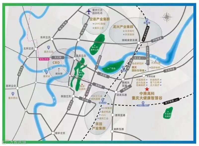 中南高科·重庆大健康智慧谷所属的重庆国际生物城,位于重庆中心城区东部,距离解放碑、江北嘴和江北国际机场均约半小时车程,重点发展生物药、化学药、现代中药和医疗器械等产业,是重庆生物医药产业唯一的重点关键产业园。市委市政府关注支持重庆国际生物城建设,量身定制了“总体规划”“三年行动计划”“科技成果转移转化示范地若干措施”三大市级红利,明确了打造“长江流域具有影响力的国际生物城”的目标定位和64平方公里的空间规划。市政府成立由分管工业的副市长任组长的市级工作小组,释放红利、赋能发展。