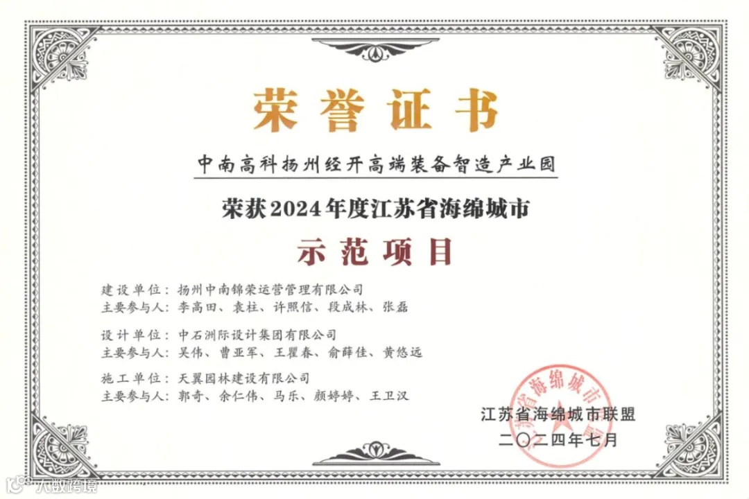 近日,由江苏省住房和城乡建设厅指导开展的“2024年度江苏省海绵城市示范项目颁奖仪式”在南京举行。凭借在海绵城市建设中的卓越表现,中南高科扬州经开高端装备智造产业园获评“2024年度江苏省海绵城市示范项目”。这是继去年中南高科靖江智造谷产业园项目获“江苏省海绵城市优秀工程项目二等奖“后,高科园区再次获评该类省级荣誉。