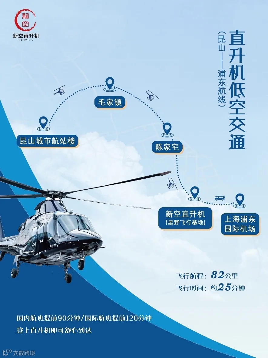 8月10日,浦东国际机场至昆山城市航站楼双向空中的士载客服务试点成功。直升机从昆山城市航站楼起飞,途经毛家镇、陈家宅,在浦东星野飞行基地平稳降落,让大众出行更加便利,这标志着上海—苏州长三角区域低空空中载客航线成功打通。飞行航程82公里,飞行时间约25分钟。详见↓