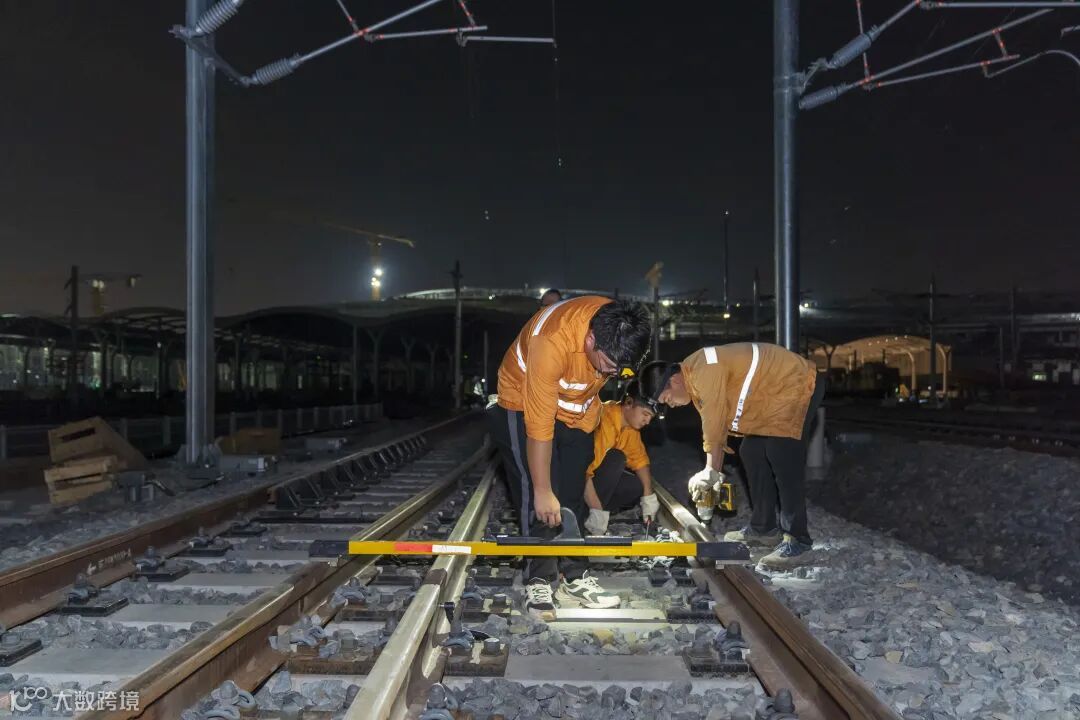 上海工务段职工对上海松江站内道岔框架尺寸进行精调(摄影:李昶)
