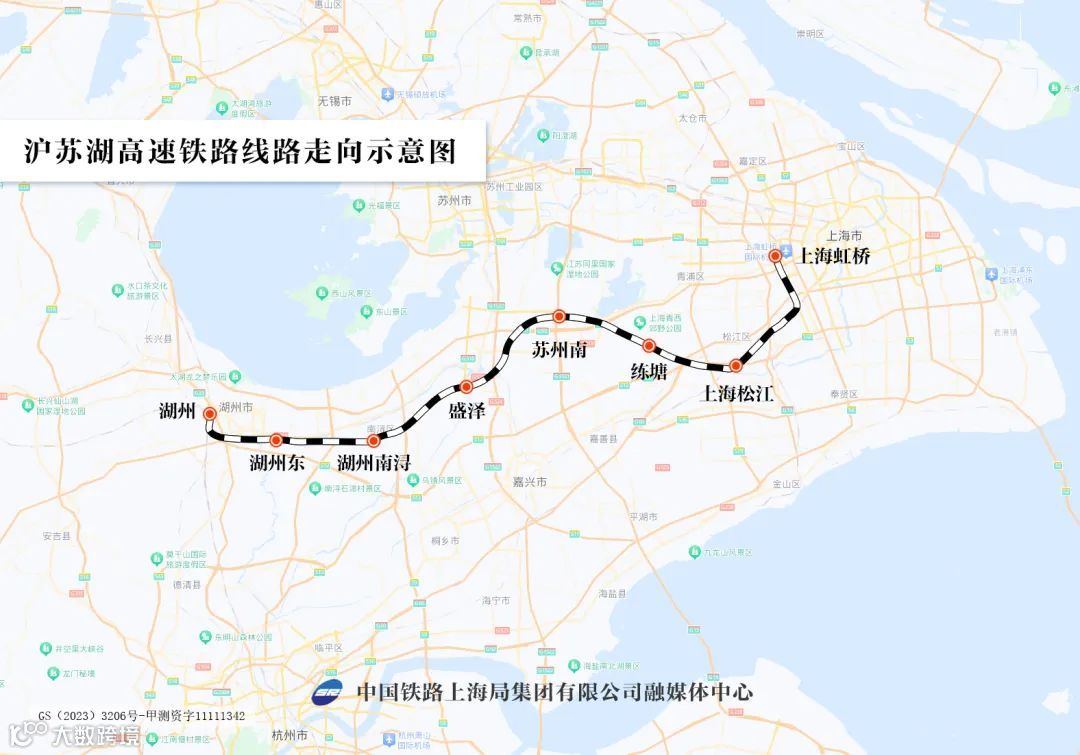 沪苏湖高铁由上海虹桥站引出,途经江苏省苏州市,终至浙江省湖州市湖州站,线路全长约163公里,设计时速350公里,设上海虹桥、上海松江、练塘、苏州南、盛泽、湖州南浔、湖州东、湖州站等8座车站。