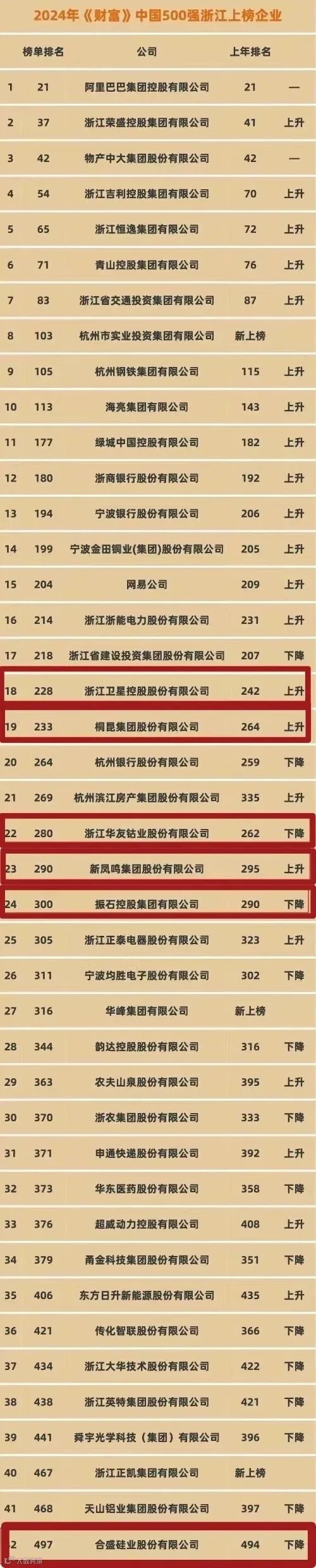 浙江共有42家企业跻身《财富》中国500强,其中,嘉兴有6家,分别是卫星控股、桐昆集团、华友钴业、新凤鸣、振石控股、合盛硅业。