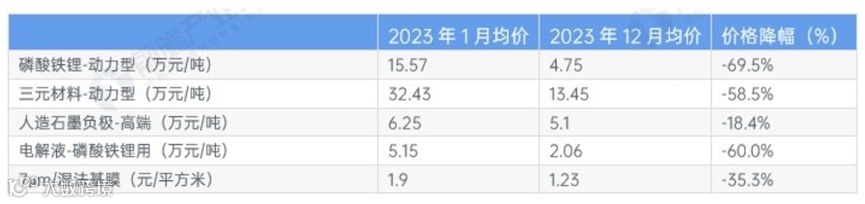 2023年,这四大动力锂电池材料价格均出现不同程度下跌,其中成本占比最高的正极材料价格下跌幅度最大,1-12月磷酸铁锂-动力型价格降幅为69.5%,三元材料-动力型价格降幅为58.5%。动力锂电池材料价格的全面下降使动力锂电池生产成本出现较大幅度下降,从而驱动动力锂电池价格下跌。