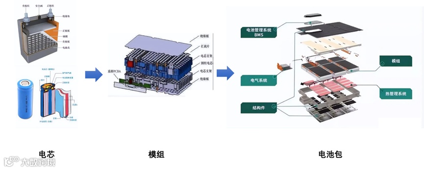 目前,动力电池的组装从小到大可以分为三个层级:电芯(也称为电池单体)、电池模组和电池包。
