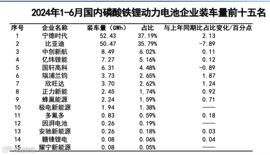 磷酸铁锂动力电池市场格局也发生了变化,宁德时代反超比亚迪成为市占率第一。从数据来看,今年上半年宁德时代磷酸铁锂动力电池装车量为52.43 GWh,以37.19%的市占率超越比亚迪——后者市占率为35.79%。从同比变动数据看,宁德时代增长了2.13%,而比亚迪则同比下降了7.89%。